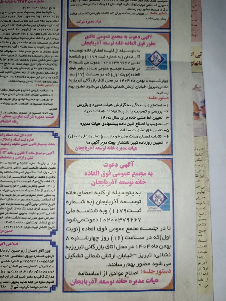 آگهی دعوت به مجمع عمومی عادی بطور فوق العاده خانه توسعه آذربایجان به شماره ثبت ۱۱۷۹